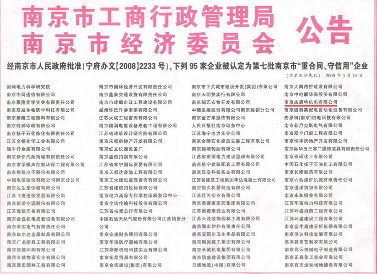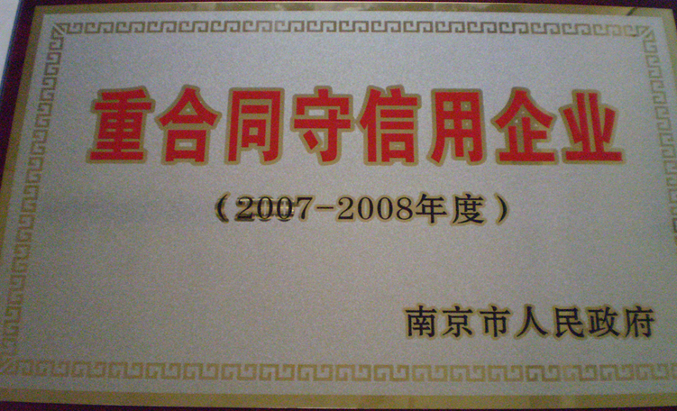 經(jīng)南京市人民政府批準(zhǔn)(寧府辦文【2008】2233號(hào)),南京杰恩特機(jī)電有限公司被認(rèn)定為第七批南京市“重合同守信用企業(yè)”之一!