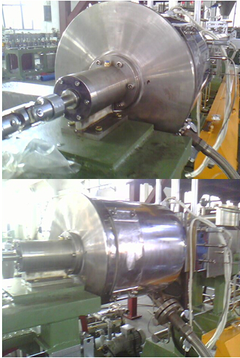 該新型水環(huán)熱切粒機的切刀盤與切刀座球型連接,能保證幾把切刀同時與機頭模板密貼,切粒效果好,軸承座設(shè)在切粒罩外部,防止軸承座因高溫而損壞,軸承座內(nèi)設(shè)油封和氣密裝置,能夠有效的阻隔水分和腐蝕氣體進入軸承,進一步提高了軸承座的使用壽命,軸承座采用特殊結(jié)構(gòu)設(shè)計,增加了刀桿的剛性,使刀桿在轉(zhuǎn)動時無跳動現(xiàn)象。該新型設(shè)計已申請專利。
